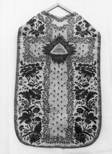 Chasuble blanche en coton (indienne ou toile de Jouy) imprimé en bleu et rouge.