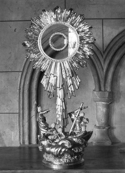 Grand ostensoir dont le pied représente le Christ apaisant la tempête. Les têtes, les bras et les jambes sont en ivoire.