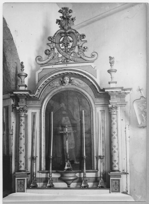 Retable à travée unique présentant un tableau central cantonné de deux colonnes, avec un couronnement de volutes et feuillage, et deux pots à feu.