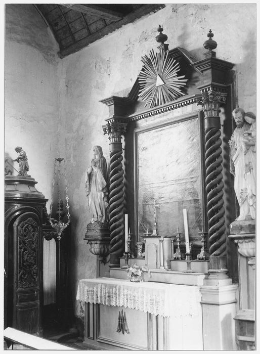 Autel surmonté de deux gradins et d'un tabernacle. Retable présentant un tableau central, cantonné de deux colonnes torsadées et ajourées. Sur le fronton, une gloire rayonnante, et trois pots à feu tournés du couronnement.