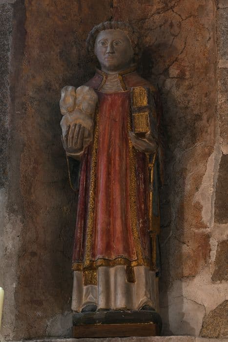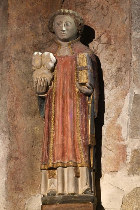 Saint Etienne tenant un livre dans la main gauche et trois pierres dans la main droite.
