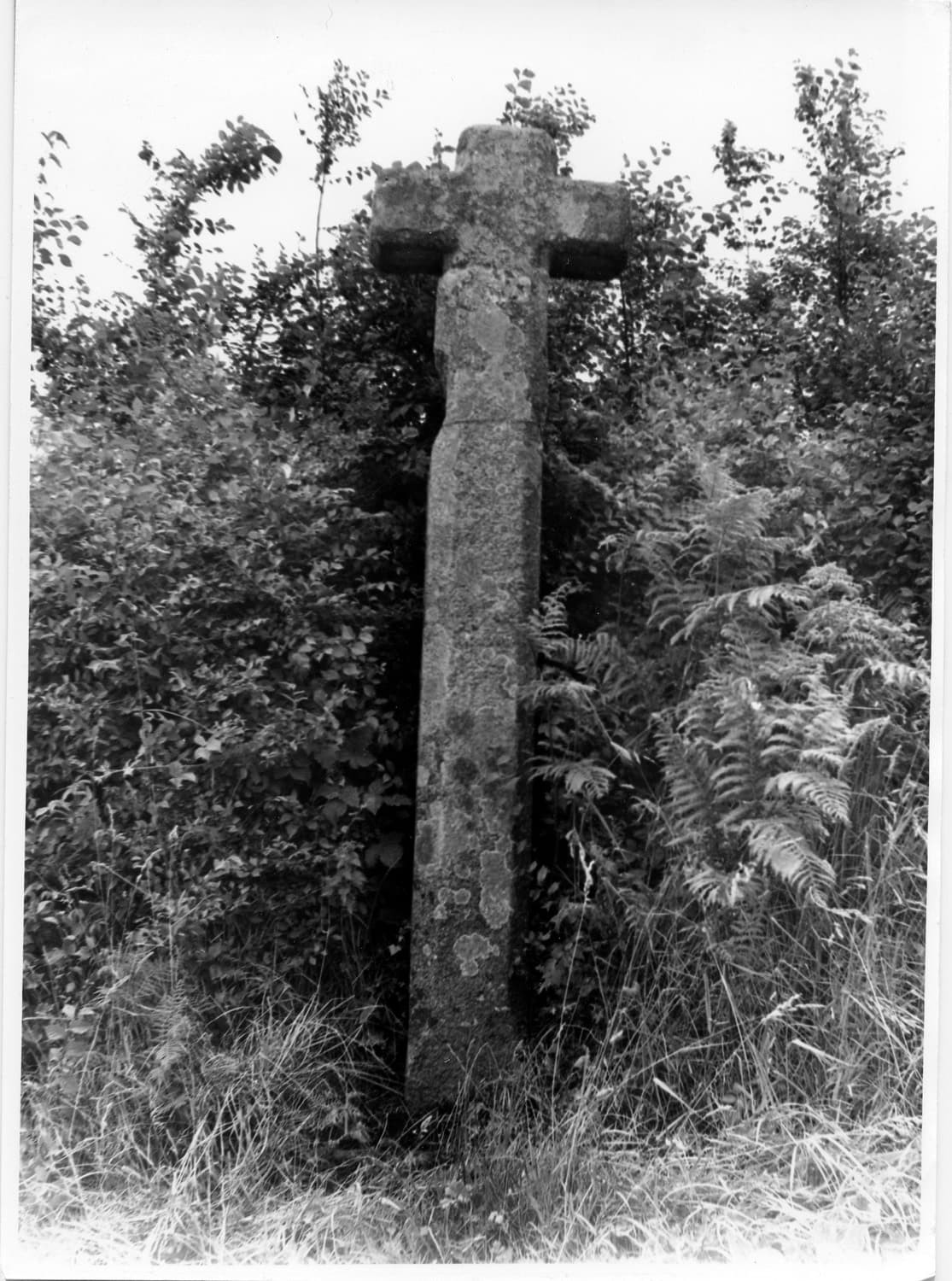 Croix Blondel, située en bordure de la route N804. Il s'agit d'une croix monolithe rompue, en granite de Flamanville, reposant sur un dé.