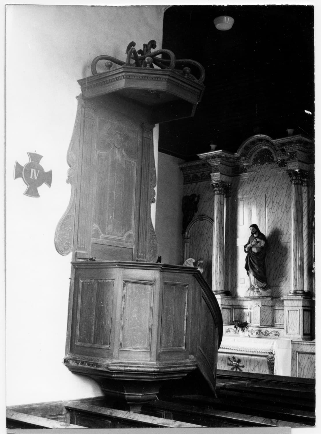 Chaire à prêcher, son escalier, son dorsal, son abat-voix et son couronnement surmonté de volutes.