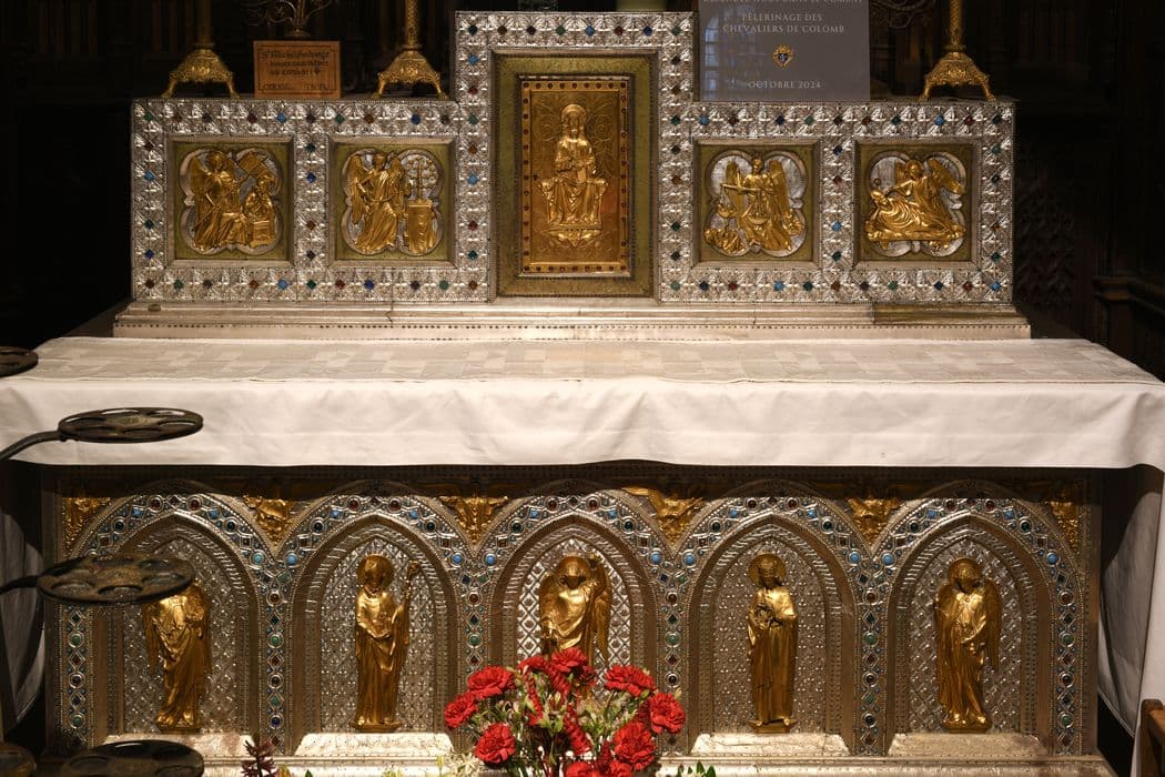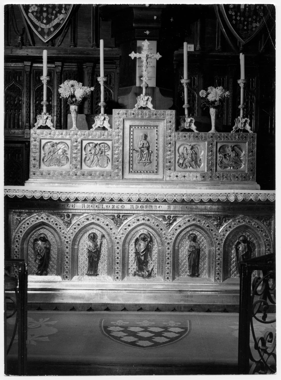Feuilles d'argent repoussé sur âme de bois ou feuilles de laiton argenté sur âme de bois, et bronze doré (statuettes et bas-reliefs).
