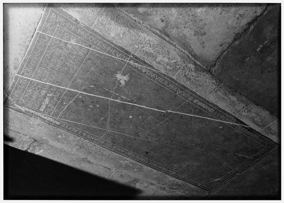 Epitaphe : Soubz ce to[m]beau repose[n]t les co-rps de Iacques Heuze esc[uye]r, S[ieu]r du Vieil Manoir, & Damoiselle Perrette Le Breto[n] sa f[emm]e, - Lesquelz ont vesquy 61 an[s] mari-ez et mourut ledit s[ieur] au mois d'octobre 1625 aagé de 86 ans, & la dite damoiselle - au moys de juin 1627 aagez de - 80 ans. Cy faict mettre & po-ser par M. Nicollas Heuze esc[uyer], - bai[lly de] Bricquebet leur - filz. Dieu leur face pardo[n].