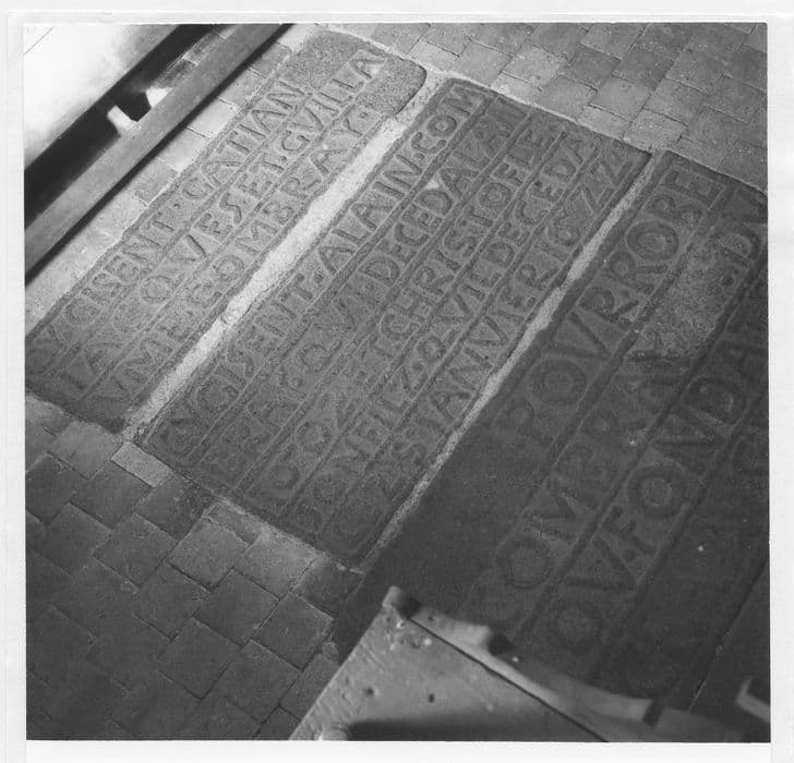 Pierre tombale d'Alain Combray (mort en 1602) et de son fils Christofle (mort en 1622).