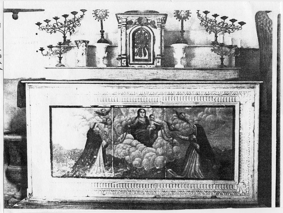 Tableau représentant la donation du rosaire et son encadrement formant le devant d'autel d'un autel secondaire.