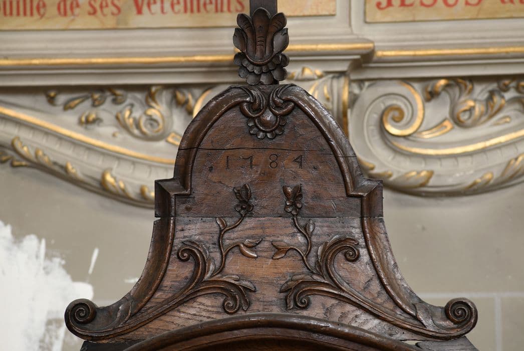 Confessionnal à porte galbée avec deux panneaux grand cadre. Le panneau inférieur est plein, le supérieur est sculpté de coquilles, de marguerites, et ajouré. Le dessus de porte est un panneau chantourné décoré de volutes et feuillages et sommé d'une croix latine. Chaque côté est percé d'une ouverture étrésillonnée avec panneau coulissant. Bois de chêne ciré, pentures et serrure en fer.