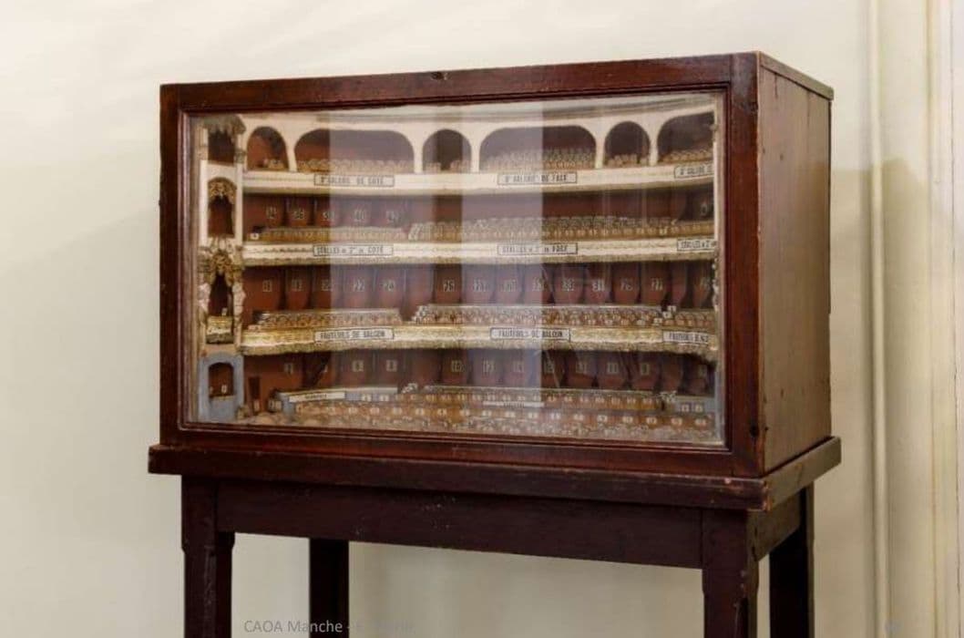 Maquette de présentation du théâtre avec les dispositions et la numérotation des places. Papier, carton, bois (acajou ?) et verre (structure)