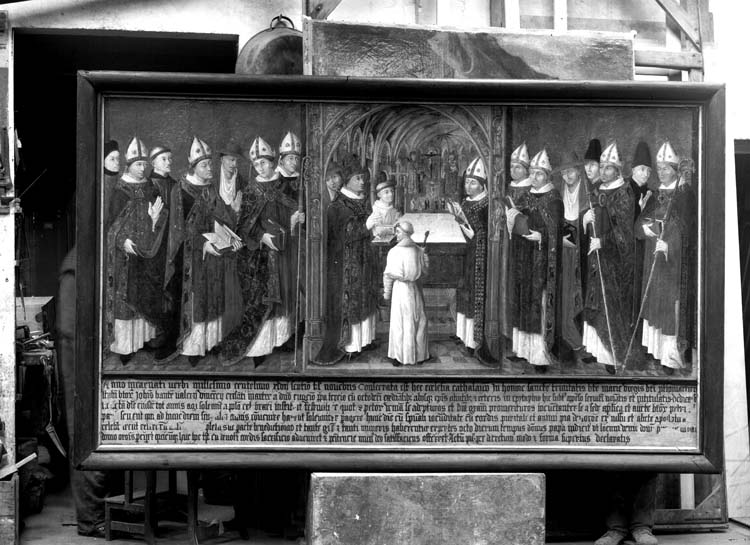 Panneau peint. Le pape devant l'autel procède à la consécration avec autour de lui dix-huit personnages, cardinaux, abbés et clercs.