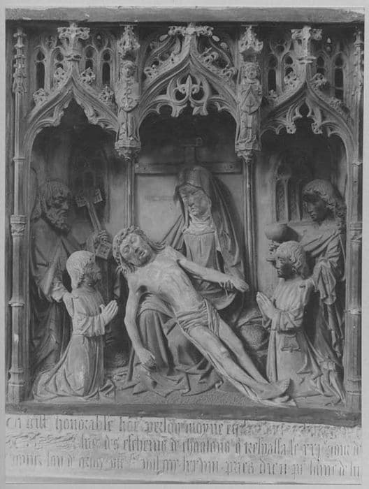 Petit monument commémoratif : Vierge à l'Enfant, aodrée par deux donateurs, bas-relief.
