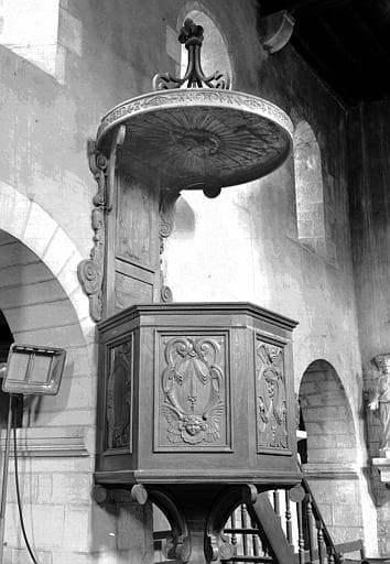 Cinq panneaux décorés de cartouches avec draperie, têtes d'anges et guirlandes. Escalier à fuseau, abat-voix garni au-dessus d'un Saint-Esprit dans une gloire rayonnante.