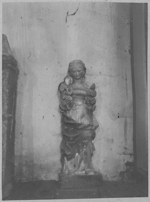 Statue brisée en plusieurs endroits. Vierge représentée en robe très ajustée, tenant l'Enfant sur son bras droit et un grand bouquet dans sa main droite.