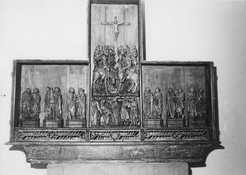 Comporte la Crucifixion et les Apôtres, en six groupes de deux statuettes.