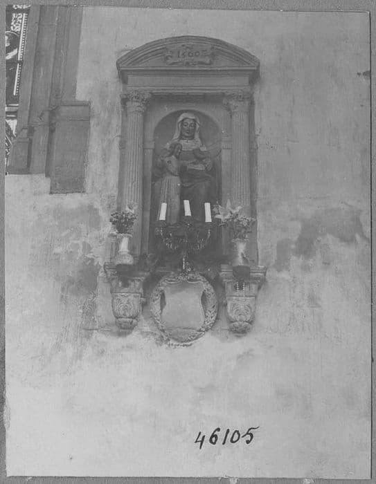 Niche surmontée d'un fronton et encadrée de deux colonnes ; au-dessous est un écusson gratté.