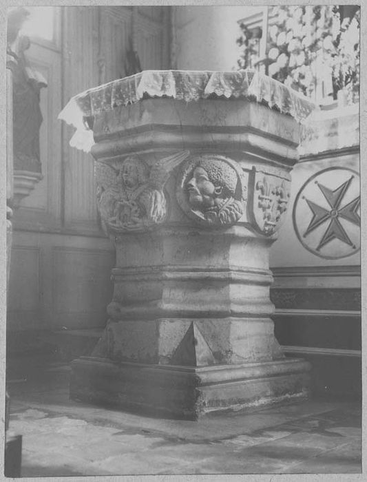 Ces fonts, sur plan octogonal, sont formés d'une cuve portant, sculptés en bas-relief, sur ses faces, deux effigies de profil, un ange et deux écussons à fleurs de lys ; la base est moulurée.
