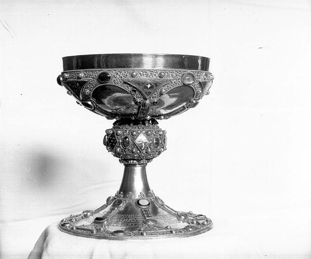 Calice formé d'un pied circulaire orné de pierres et portant une inscription gravée en creux. Tige à noeud ornée de pierres et filigranes. Calice en forme de ciboire.