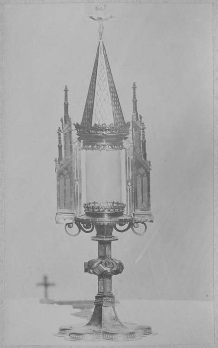 Ostensoir pédiculé, en forme de clocher à cinq faces. Il affecte la forme d'un clocher dont la flèche en cuivre doré est épaulée par deux contreforts ; la tige, interrompue par un noeud à boutons en losange, émerge d'un base à six lobes ; entre les contreforts qui portent le clocher, un tube en cristal se lève à volonté.