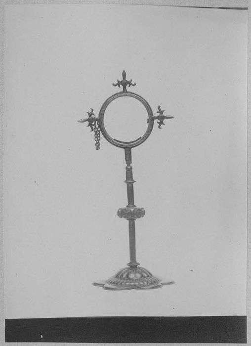 Ostensoir en forme de croix cantonnée de fleurs de lys. Ostensoir sur pied composé d'un socle polylobé, d'une tige à bouton et d'une monstrance circulaire, en verre, cantonnée de trois fleurs de lys formant croix, ornée d'une pierre.