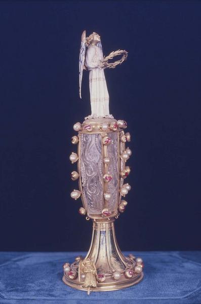 Reliquaire sur socle circulaire formé d'une coupe en cristal de roche montée de six bandes d'or ornées de pierres et de perles. Pied à base circulaire orné également de pierreries et d'émaux. Sur le couvercle, statutte d'ange d'or émaillé en blanc, tenant la couronne d'épine.