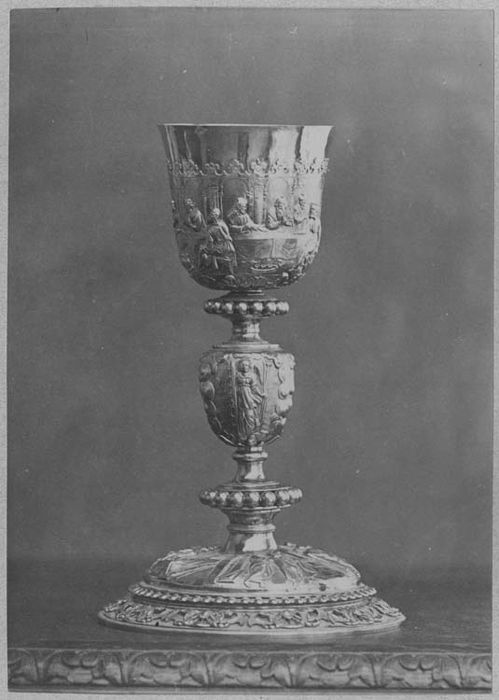 Calice : sur un des noeuds, les anges porteurs des instruments de la Passion ; sur le pied, le Lavement des pieds ; sur la coupe, la Cène. Patène : le Christ en croix, au centre d'un décor floral.