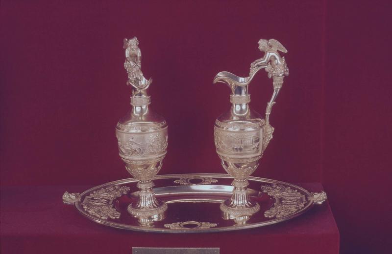 Burettes aux pieds ornés de feuilles d'acanthe, plat et sonnette. Les burettes sont ornées au pied, de feuilles d'acanthe. Sur l'une est représenté Noé ayant goûté du fruit de la vigne, ses enfants le couvent d'un manteau ; sur l'autre, Moïse sauvé des eaux. Un ange pressant du raisin, un autre tenant des roseaux, forment les anses. Aux extrémités du plat sont représentés, dans deux médaillons octogonaux rapportés, Saint Jean baptisant Jésus Christ et Jésus au puits de Jacob, avec la Samaritaine. Clochette à poignée à décor de pomme de pin et palmettes.