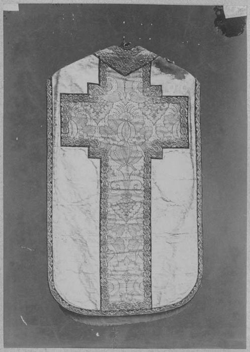 Chasuble du sacre de Louis XIII, drap d'argent damassé, orfroi en drap d'or broché (avec des liserets rouges et galons en velours rouge broché).
