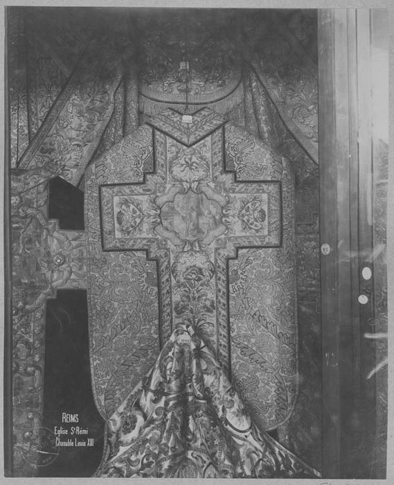 Lors du sacre, Louis XIII se montra généreux envers l'Eglise de Reims, et des quatre chapes et sept tuniques qu'il donna, rien n'a échappé au vandalisme de 1793. La chasuble seule a été conservée, mais elle est bien déteriorée.
