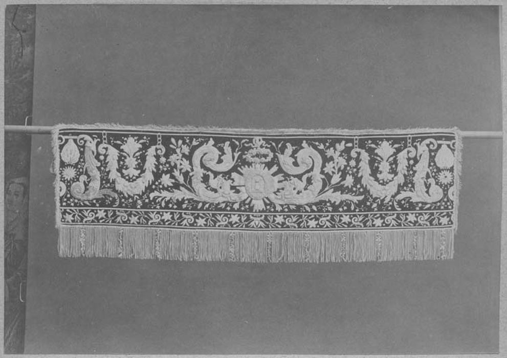Epoque Louis XVI. Fiche documentaire : 'Dais de la sainte Ampoule' et 'transporté au trésor de saint Remy après restauration, provient des caisses du palais du Tau'.