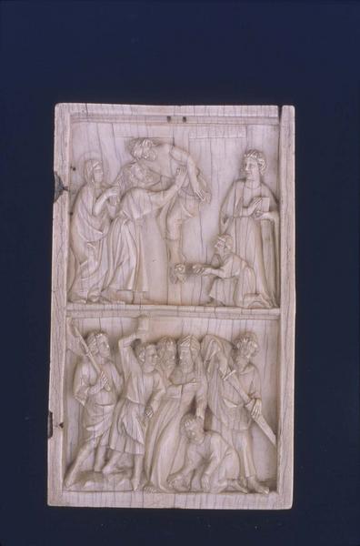 Trois tableaux, ivoire sculpté. Petit panneau en ivoire, élément d'un diptyque : panneau d'un diptyque orné de deux scènes de la vie du Christ (Baiser de Judas et Descente de croix) ; sur la gauche de l'encadrement, traces de deux charnières disparues et deux perforations ; sur la partie supérieure de l'encadrement, deux autres perforations. Deux panneaux d'ivoire formant diptyque : diptyque en deux panneaux représentant quatre scènes de la vie de la Vierge figurées dans des quatre-feuilles ; l'un des volets est marqué d'un encadrement dans lequel s'inscrivent deux quatre-feuilles. Fiche documentaire : 'diptyque plus une plaque d'ivoire d'une dimension plus grande que celle du diptyque'.