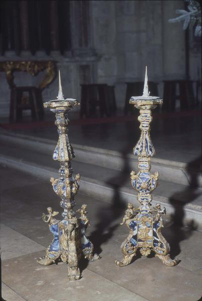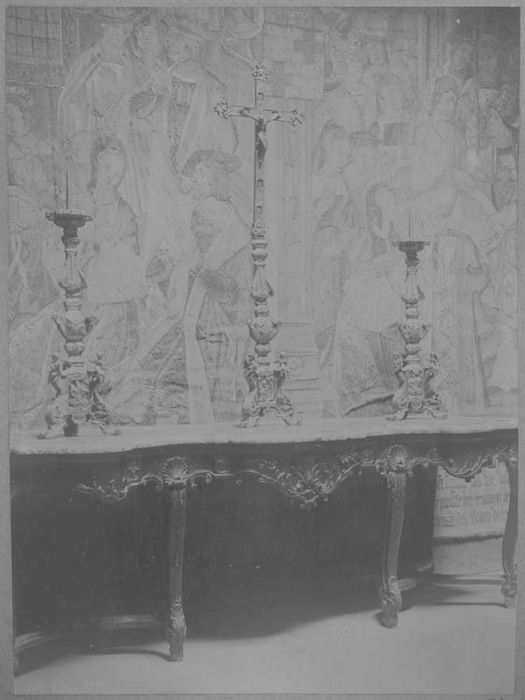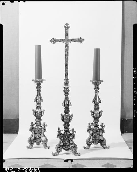 Travail italien. Cette garniture, rapportée de Rome, suivant la tradition, par un religieux Minime, décorait l'autel de l'église des Minimes. La croix et quatre chandeliers ont disparu.