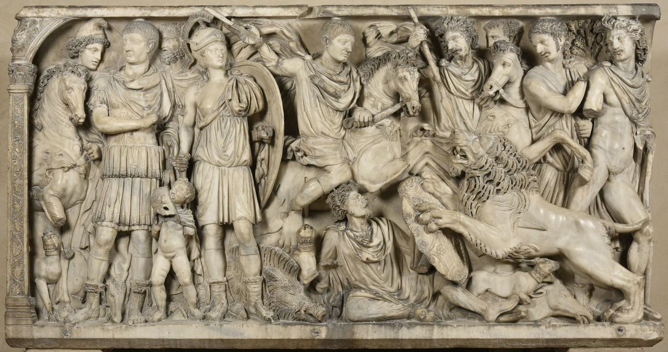 Sarcophage antique, dit tombeau de Jovin, marbre. Cuve tombale dont la face principale est ornée d'une scène de chasse en haut relief. Au centre, un cavalier s'apprête à lancer un javelot sur un lion attaquant un homme à terre. A gauche, un homme en tenue de militaire romain est encadré entre une femme casquée et un cheval tenu par personnage à bonnet phrygien. A droite, deux personnages.