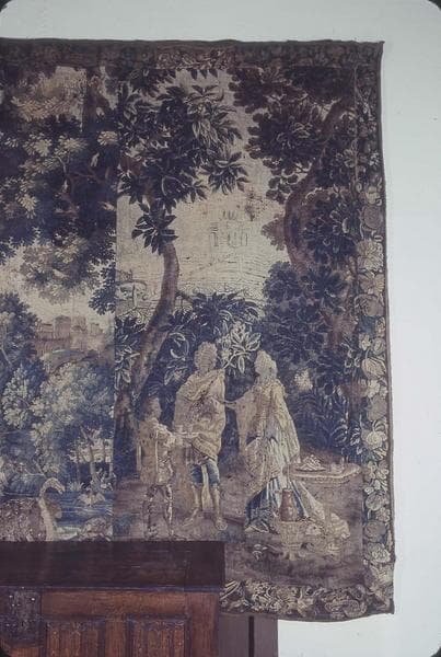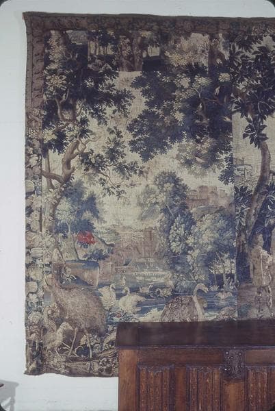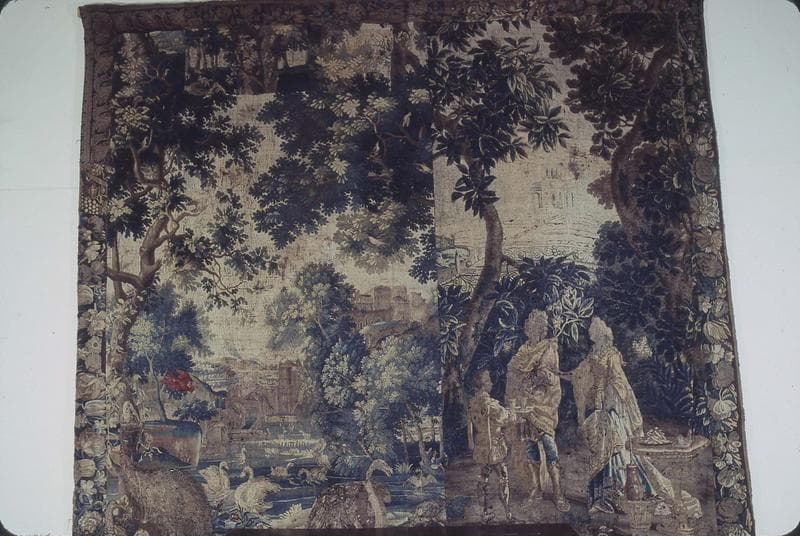 2 pièces murales : Oiseaux, paons, faisans et arbres, Homme et femme a qui un serviteur apporte une collation