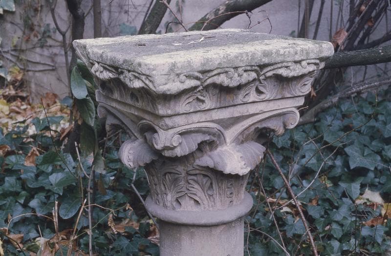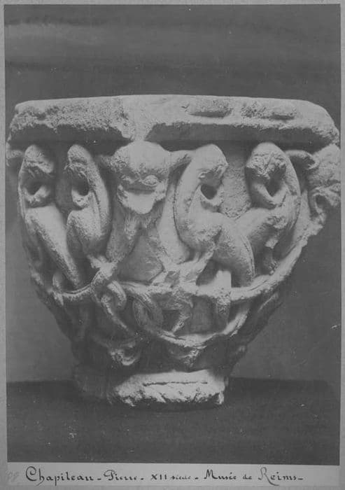 Chapiteau à décor de palmes et de perles. Corbeille décorée de deux feuilles épanouies formant crosses et d'une feuille centrale. Tailloir décoré d'une guirlande de feuilles enroulées.