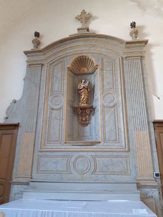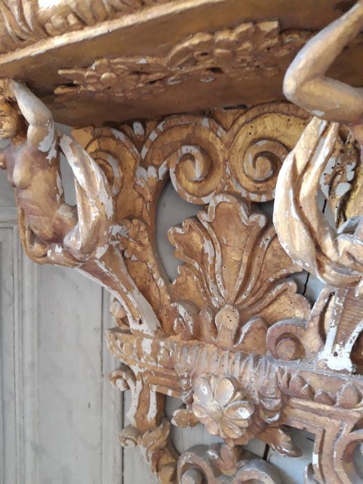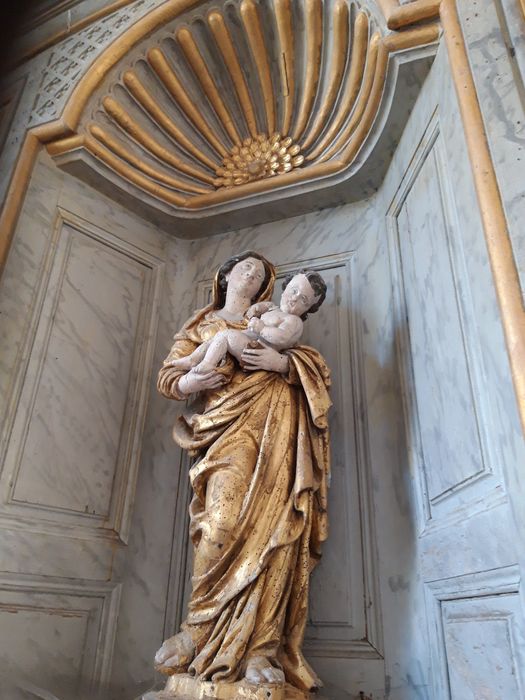 Vierge à l'Enfant, statue, bois, 17e siècle, et console lui servant de support, bois sculpté et doré, 16e siècle. La console Renaissance en bois doré est un vrai chef-d'oeuvre de finesse et de goût. Deux sirènes placées aux angles soutiennent la tablette. Leur buste nu jaillit de feuillages et d'ornements stylisés.