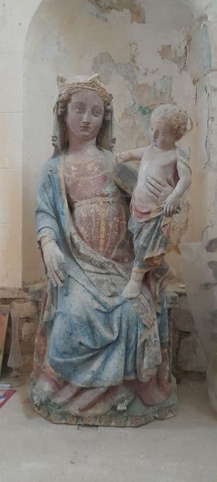La Vierge est assise soutenant de sa main gauche l'Enfant debout sur ses genoux. Base fragmentée. Tête et bras de l'Enfant détachés. Couleurs sous-jacentes.