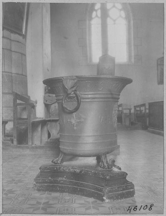 Inscription : facet au Sslettes Bastren Baillet (autour du bord extérieur, en relief). Inscription : l'an 1605 Basten (sur la partie médiane, tracée à rebours, se lisant de droite à gauche). Date : 1605 (sur la partie médiane, tracée à rebours, se lisant de droite à gauche).