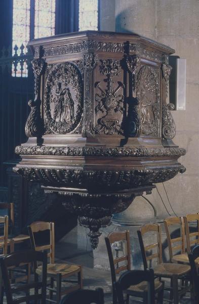 Chaire à prêcher de l'arrière-choeur. Sur la cuve, trois panneaux sculptés avec des scènes de la vie de sainte Thérèse (sainte abbesse). Chaire formée d'un escalier et d'une cuve. Sur la rampe, panneaux sculptés représentant un aigle aux ailes déployées.