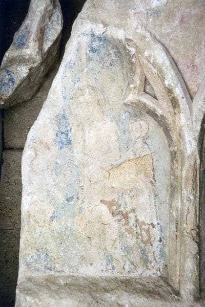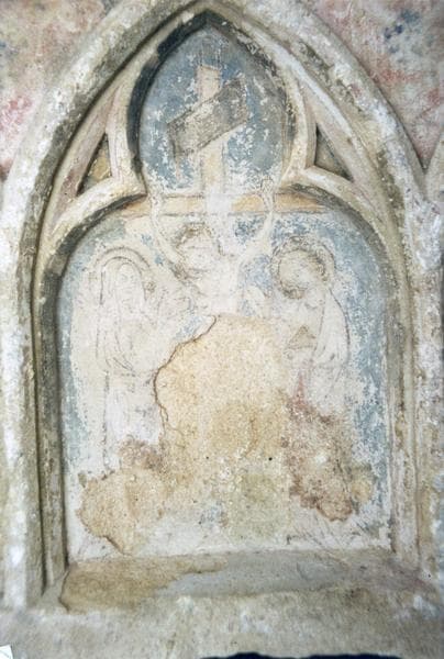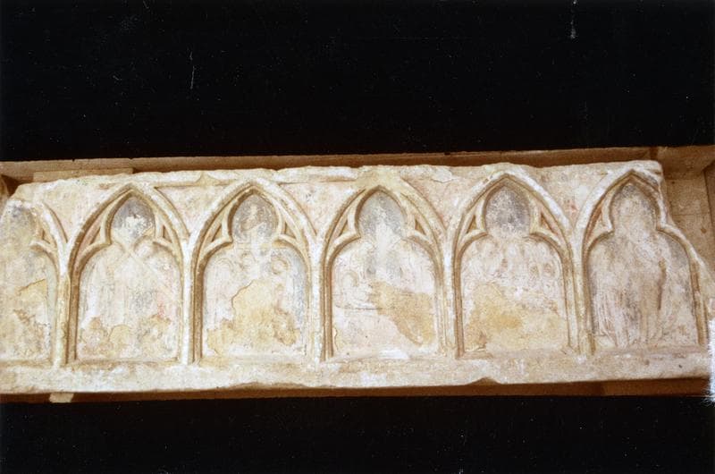 La Passion, fragment de retable, six scènes peintes, pierre polychrome. Pierre moulurée et peinte. Fragment de retable composé de six arcatures juxtaposées dans lesquelles s'inscrivent six scènes de la Passion du Christ : Ecce Homo, le Portement de croix, la Crucifixion, la Mise au tombeau, les Saintes femmes au tombeau et une dernière scène peu lisible, qui peut être une Apparition du Christ après la Résurrection.