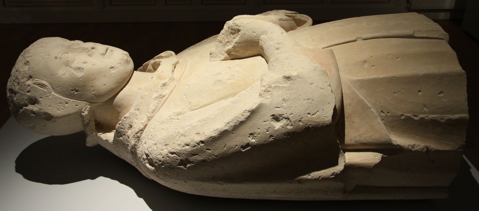 Il s'agit peut-être de gisants représentant Thierry Fretel et sa femme dont la famille avait fondé une chapelle vers 1350 dans l'église. La statue actuellement dans le bras sud du transept (face est) a été découverte en 1935 au cours d'une restauration d'un mur de l'église. Les lettres '... retel' ont été alors déchiffrées sur le socle de la statue. Peut-être s'agit-il de la femme de Thierry Fretel. La statue du buste d'homme (conservée dans le sous-sol du musée) a été trouvée en 1986 lors des fouilles le long du mur du bras du transept. Les ressemblances stylistiques avec la statue découverte en 1935 sont évidentes (même type de plis, mêmes yeux gonflés). Mais la statue, qui pourrait être celle de Thierry Fretel, a été sciée et n'a plus sa partie inférieure. Il est difficile de dire s'il s'agit de gisants.