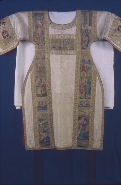 Tunique. Dalmatique de soie beige avec broderies représentant des scènes de la vie de la Vierge bordées de galons d'or.