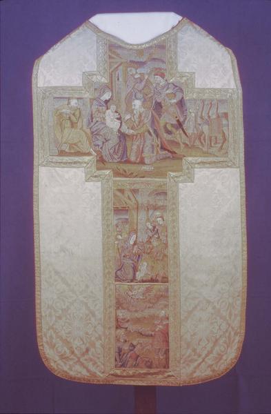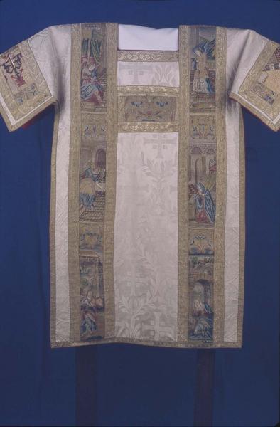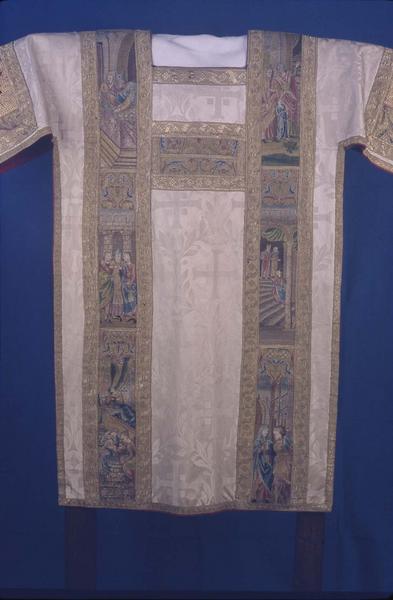 Tunique. Dalmatique de soie beige et doublure rouge. Orfrois anciens entre galons d'or, représentant des scènes de la vie de la Vierge.