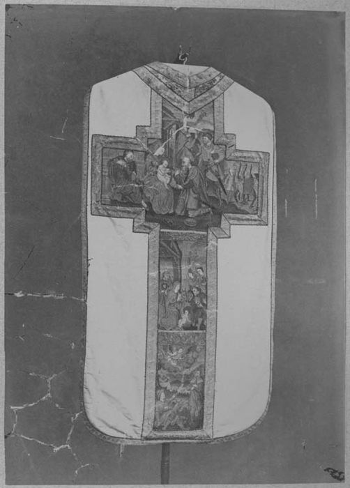 Chasuble de soie ou satin beige avec trois scènes brodées représentant l'Annonce aux bergers, la Nativité et l'Adoration des mages. Sur la face avant, deux scènes, dont le Songe de Joseph.