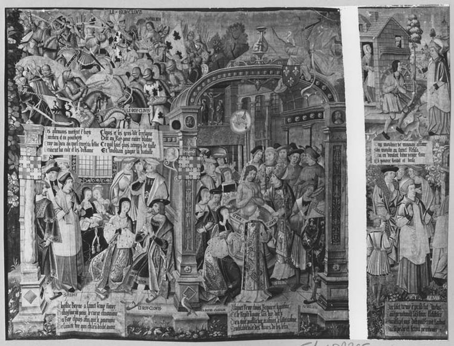 pièce murale de la tenture de la vie de saint Remy : Bataille de Tolbiac (La), Enseignement de Clovis (L'), Baptême de Clovis (Le)