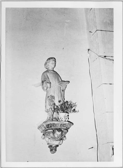 Statue représentant un homme en costume de diacre, non identifié, tenant dans sa main gauche un livre ouvert et avec à ses pieds, une vigne plantée.