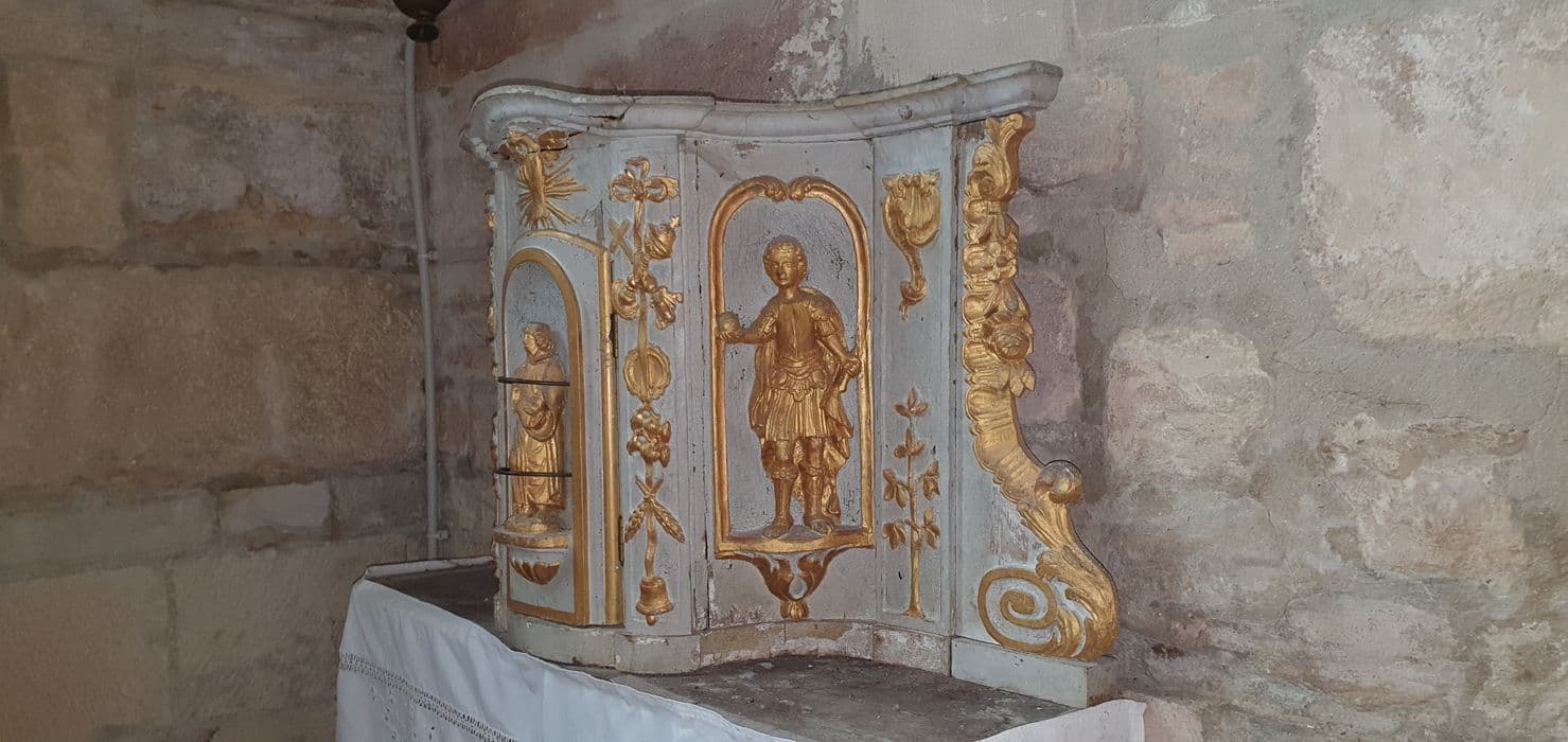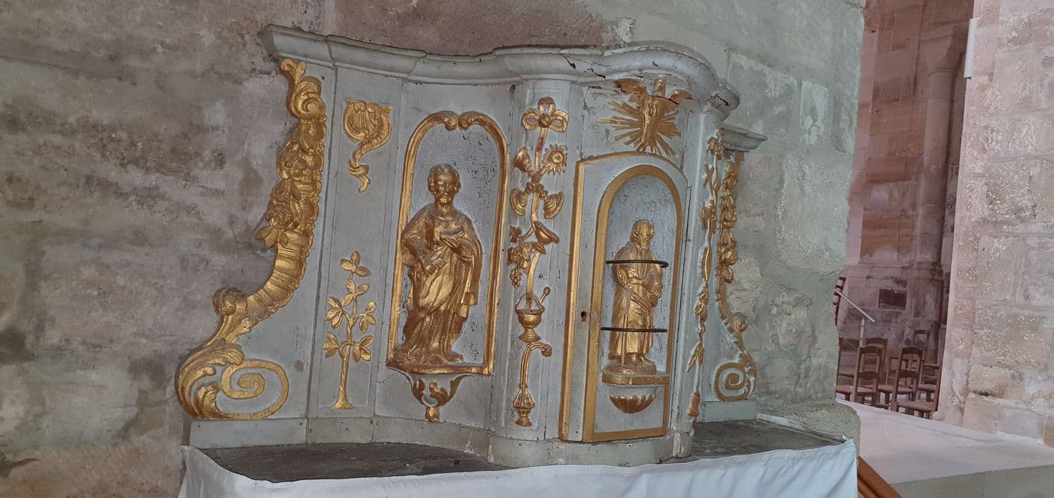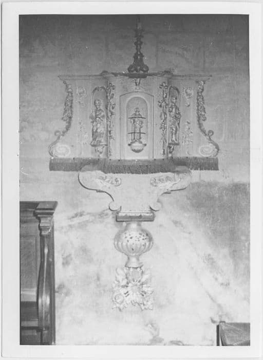 Tabernacle accolé au mur en bois rehaussé de dorure. La partie centrale correspondant à la porte est convexe et est encadrée par deux niches en retour vers le mur du fond, abritant deux figures en haut-relief. De part et d'autres, des accolades à volutes et feuillages ferment la composition, dont le sommet plat en longueur est curviligne en profondeur. L'ensemble est soutenu par une console formée de deux accolades elles-mêmes disposées sur une demi-sphère à godrons s'appuyant sur une fleur sculptée en bas-relief.