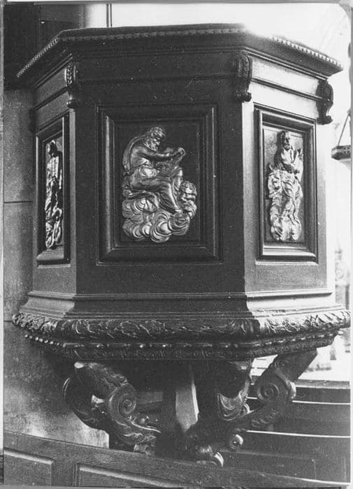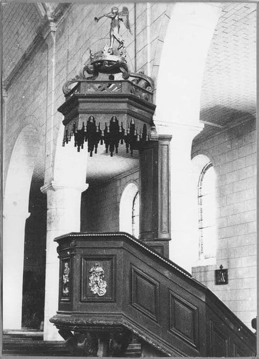 Chaire à prêcher avec abat-voix, la statue de l'ange à trompette et sa cuve avec les évangélistes et leurs symboles.