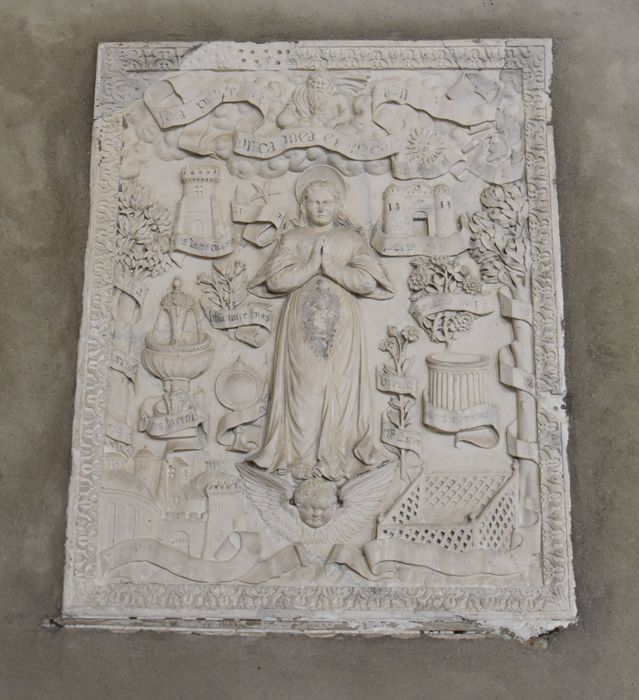 bas-relief : la Vierge entourée des emblèmes des litanies