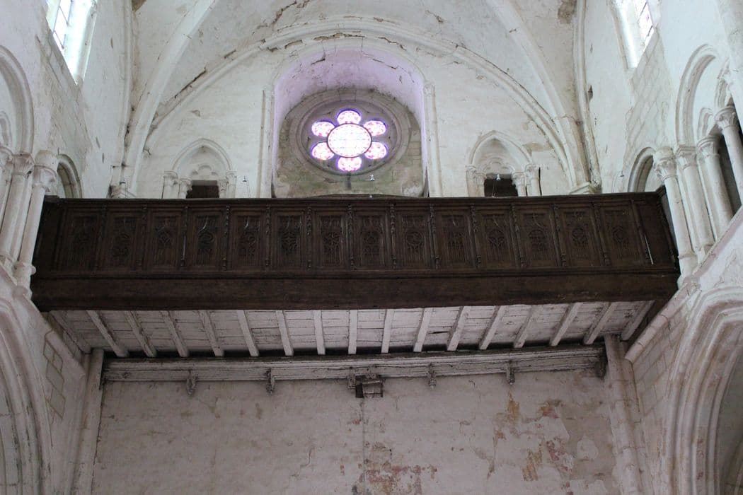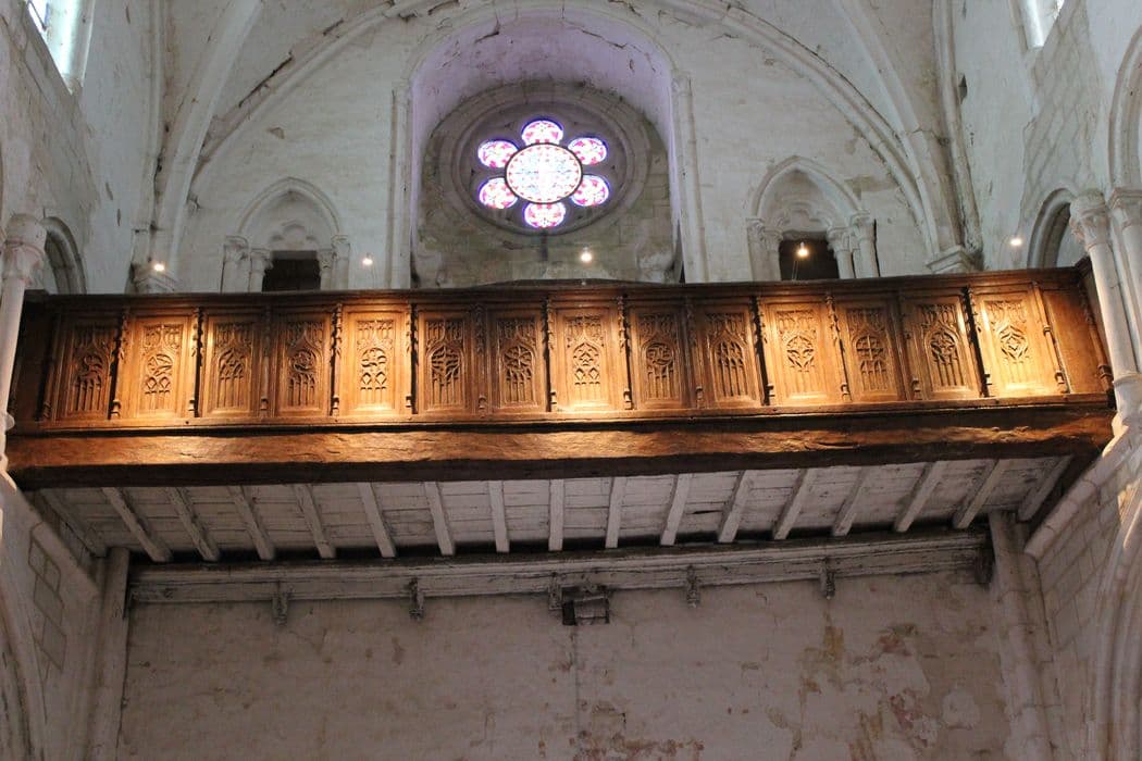 Tribune formée de quatorze panneaux sculptés de fenestrages gothiques en bois.