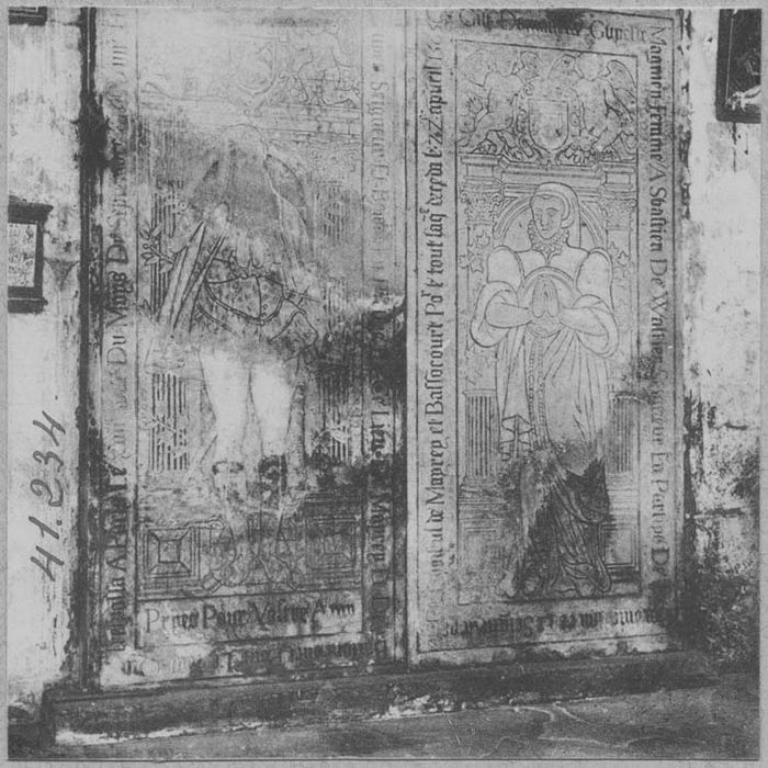 A effigies gravées. Pierre tombale de Sébastien Waltier : un homme en costume de cour placé dans une arcature encadrée par deux pilastres corinthiens cannelés, avec entablement, au-dessus écusson soutenu par deux amours et inscription encadrant le tout. Pierre tombale de Guyette Magnien : une femme les mains jointes bien drapée dans un manteau dans une arcature encadrée par des colonnes corinthiennes avec partie basse du fût cannelée et entablement, au-dessus écusson soutenu par deux amours, avec inscription encadrant le tout.